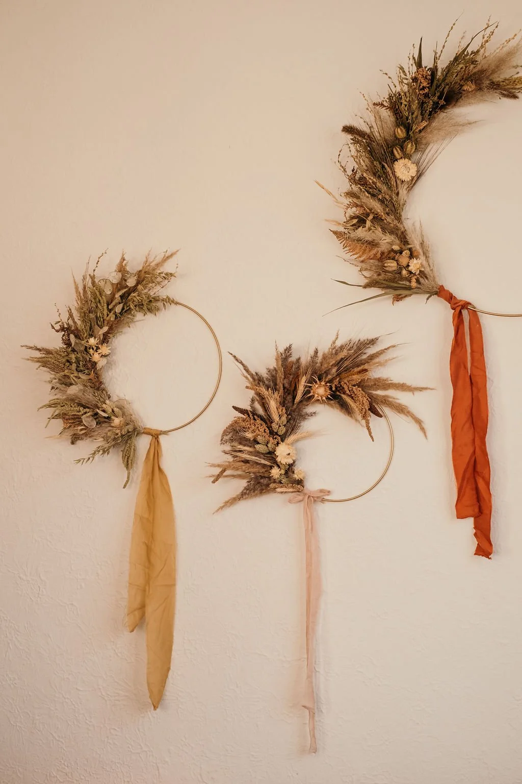 Kies je RING (goud, wit, zwart, natuurlijk) en KLEURENPALET (natural, herfstig, bright of pastel) en bepaal je DIAMETER (20 cm t/m 60 cm) dan ga ik met veel plezier voor je aan de slag!