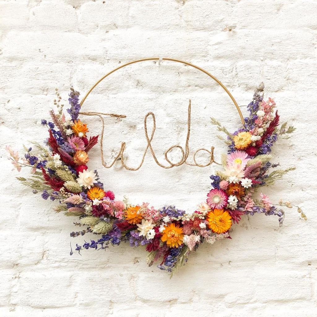 Wil je een ecologisch verantwoorde en gepersonaliseerde droogbloemenkrans voor in de babykamer?